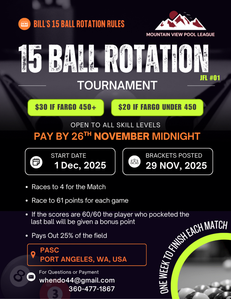 Races to 4 for the match. Race to 61 points for each game. If the scores are 60/60 the player who pocketed the last ball will be given a bonus point. Pays out 25% of the field. Click Here to know 15 Ball Rotation Rules