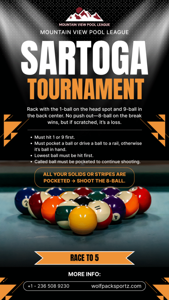 read more →Race to 5, 13-ball 8-ball (no 7 or 15), 1-ball on head spot, 9-ball in back center, call shot, no push out, 8-ball on break = win (scratch = loss), open table must start with 1 or 9, always hit lowest ball first and pocket the called ball or it’s a foul (ball in hand),…